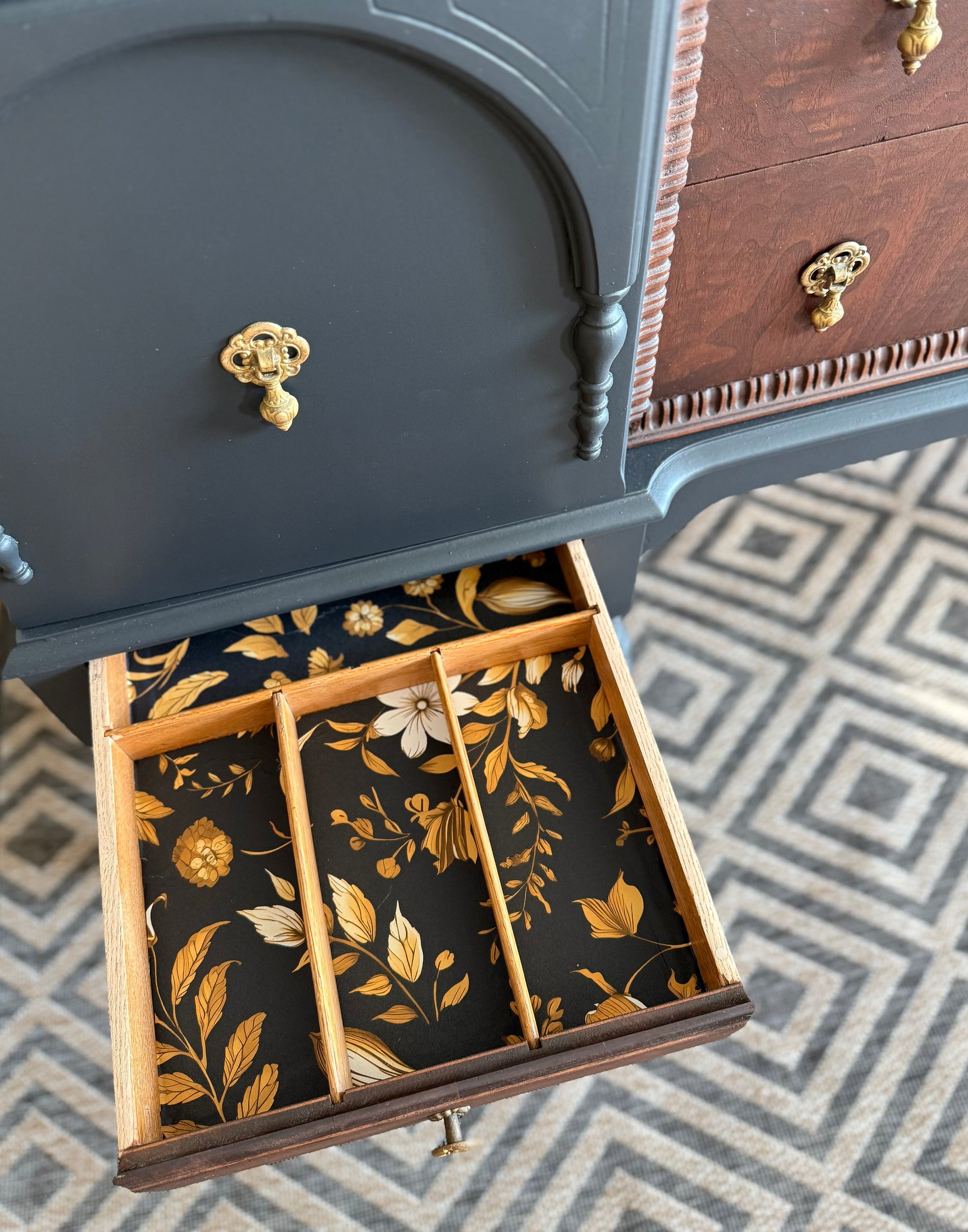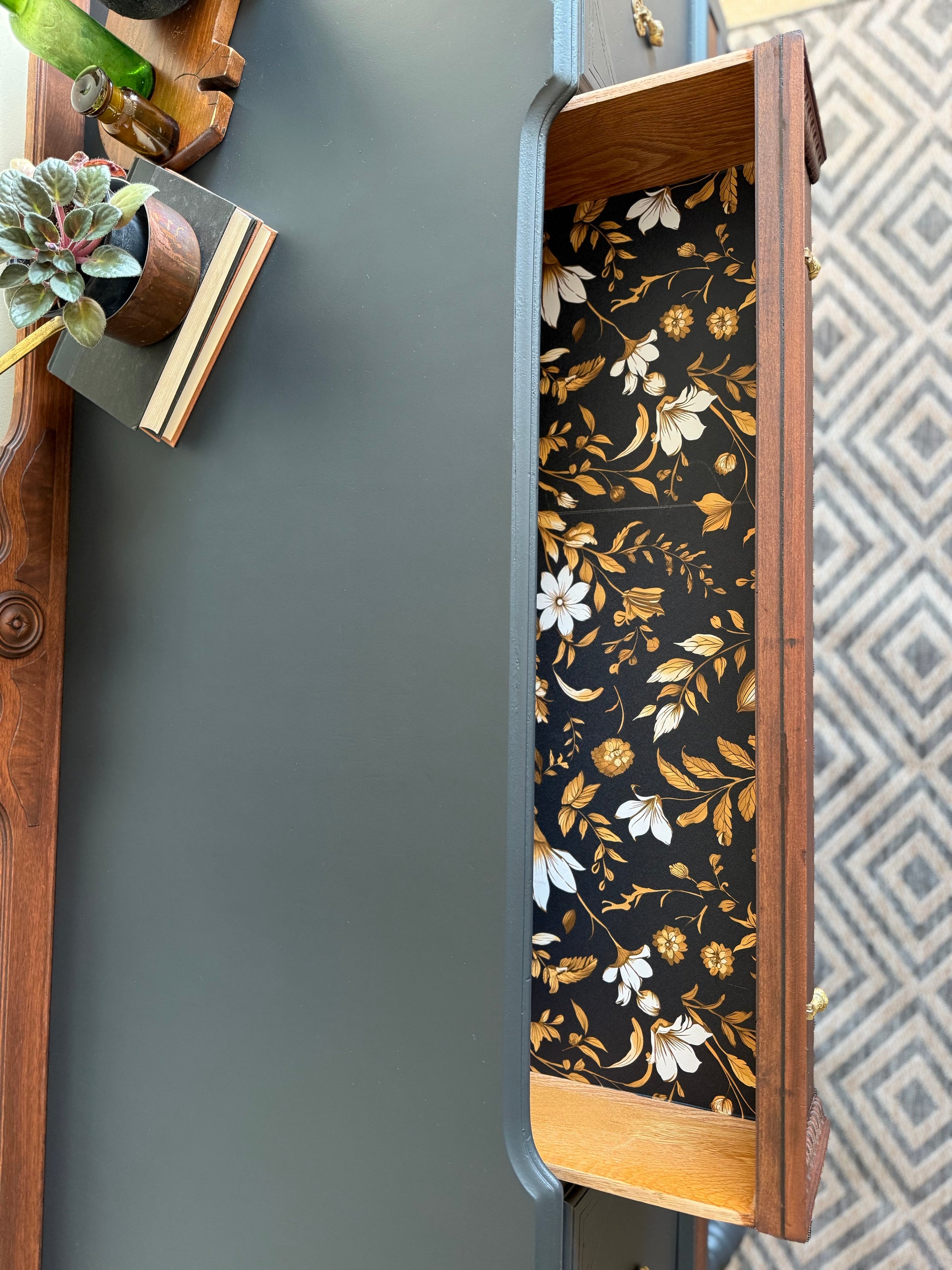 - 4 drawers (2 with dividers), all lined with elegant floral wallpaper