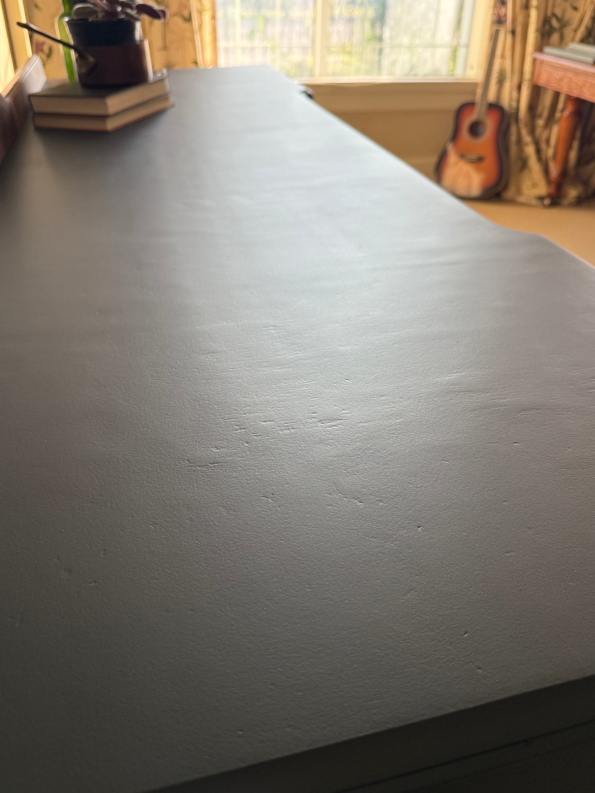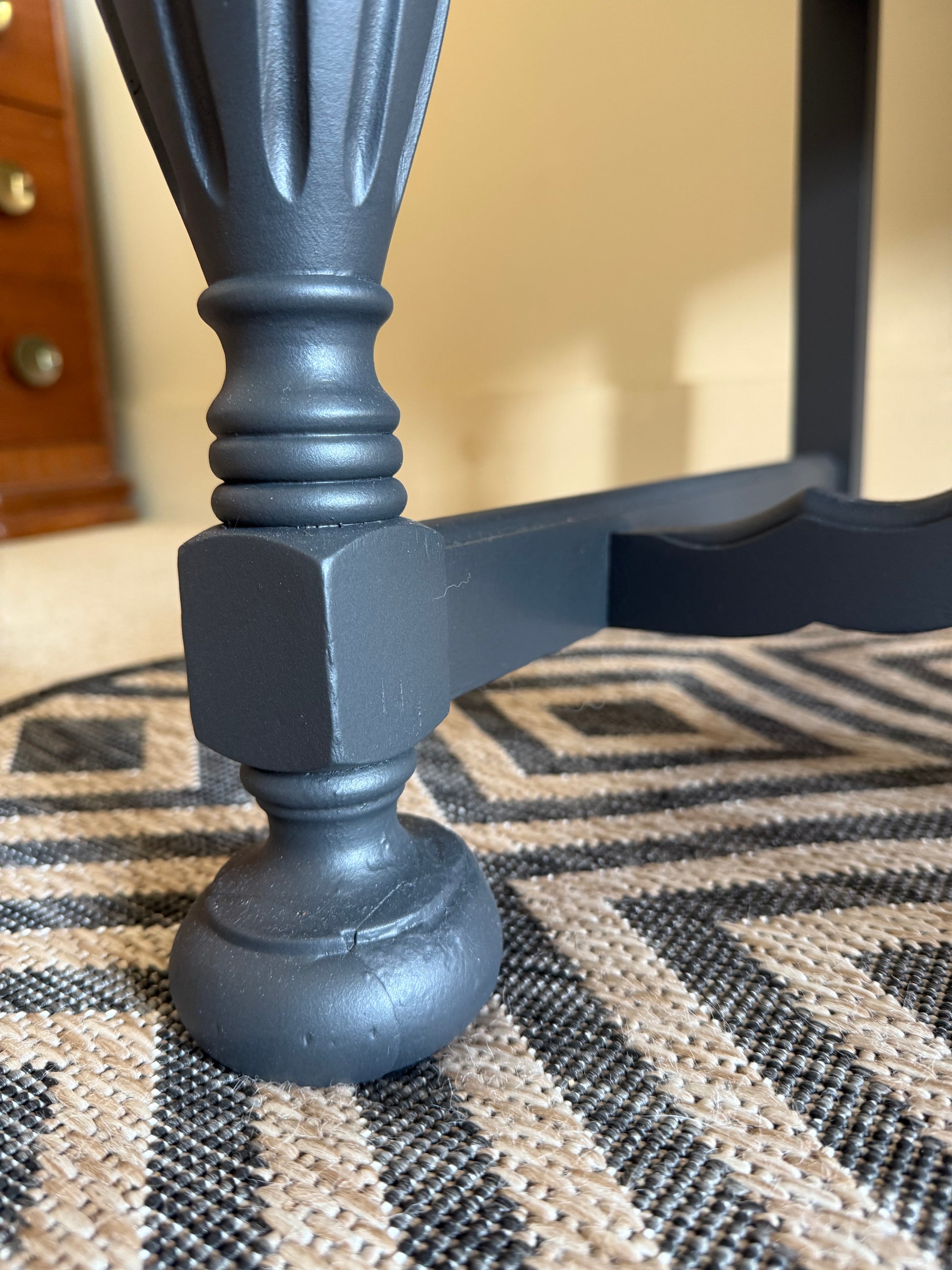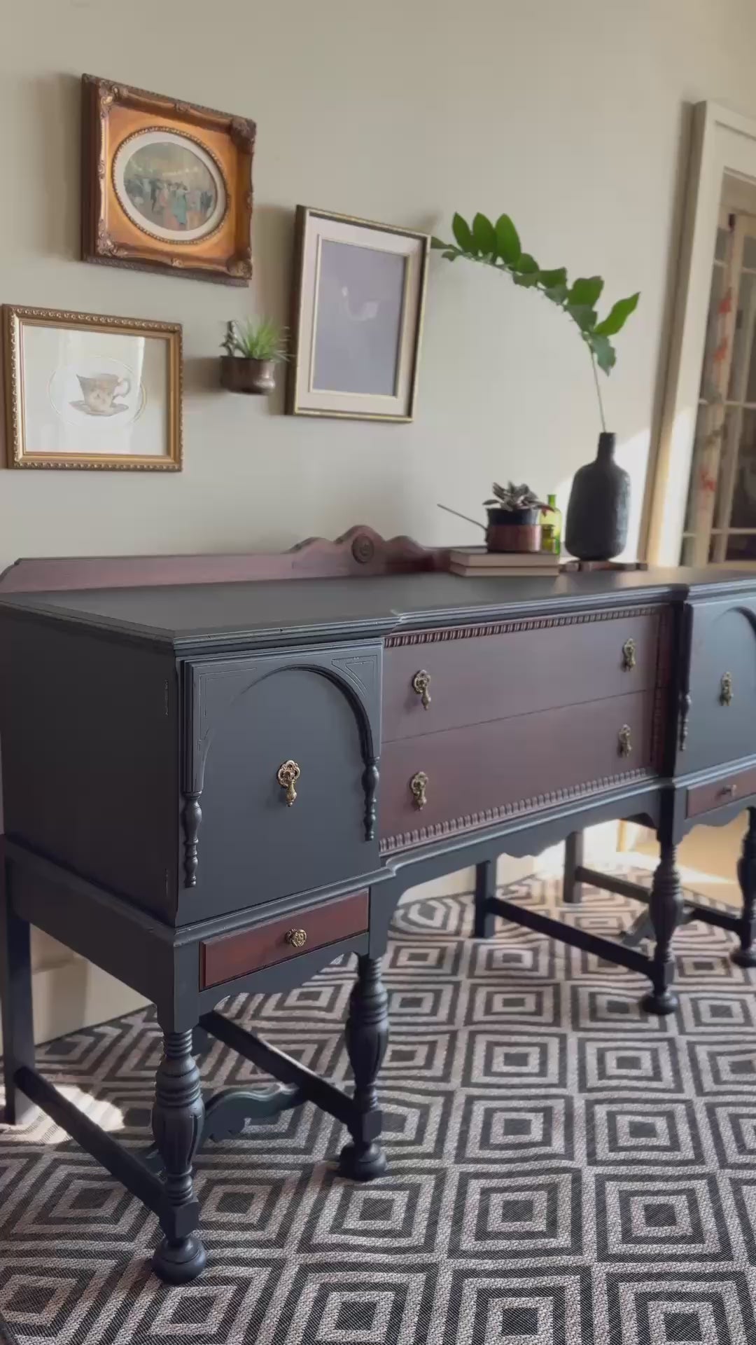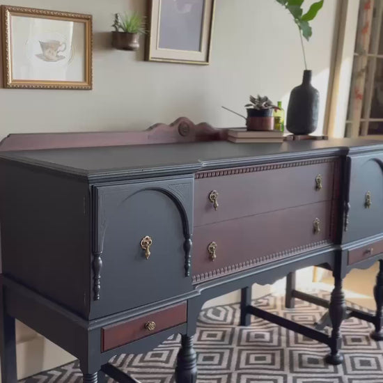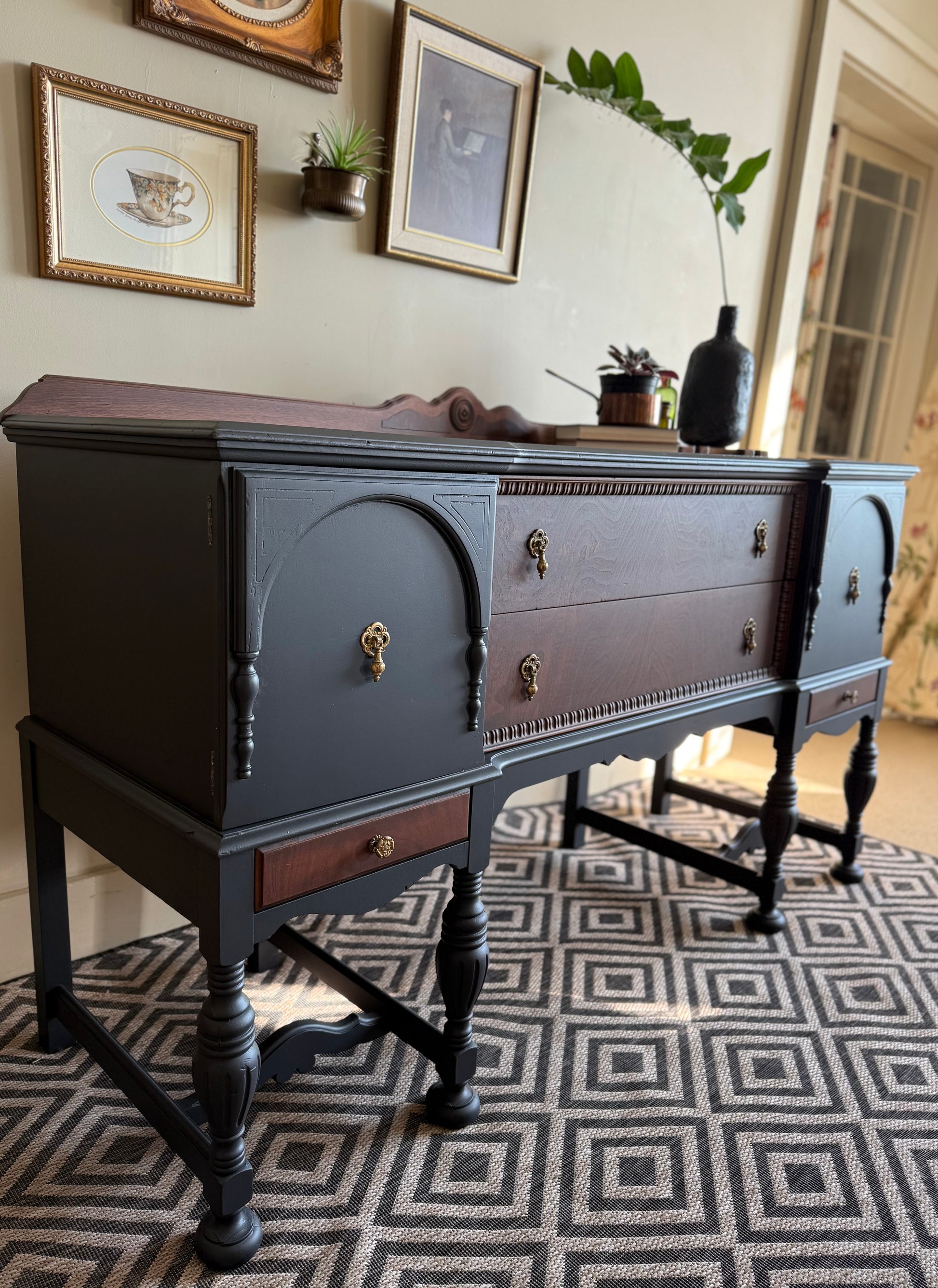 Gorgeous vintage buffet with fresh two-tone finish — matte black base (Ash by Fusion Mineral Paint) and rich wood grain drawers. Perfect for dining room storage, a stylish entryway, or even as a unique media console.